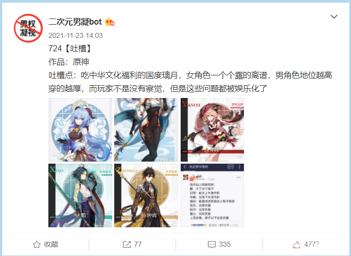 但依舊有個地方在為這種醜化行為叫好。如果要提名一個“年度最不受男性玩家喜愛”的博主,我一定毫不猶豫地推舉它——“二次元男凝BOT”。