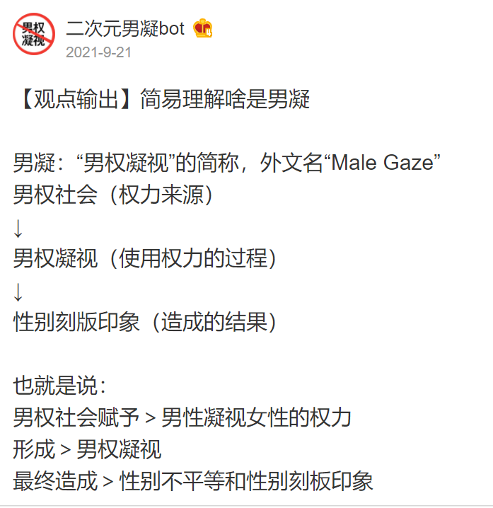 “男凝”是“男權凝視”的縮寫,指的是一切從男權視角出發的描寫、畫面、劇情與設定。請注意,BOT定義的男凝並不是我們默認的“男性凝視”而是“男權凝視”,雖然投稿人們總是忽略這一點。