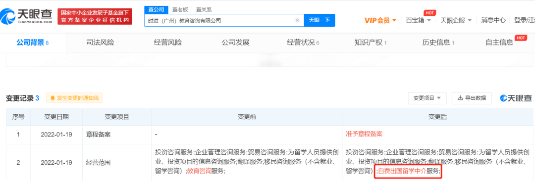 但一年後,時進(廣州)教育諮詢有限公司成立。在2021財年年報中,大地教育稱“新成立的間接外商獨資附屬公司將於2022財年展開業務。隨着有關擴展,預計可提供一個提升收益的新來源”。天眼查顯示,2022年1月,該公司經營範圍發生變更,新增自費出國留學中介服務,似乎是對大陸留學中介市場再度發起衝刺的信號。2022財年第三季度財報中,財報中還專門提到,為挽留中國時進的員工,前三季度僱員福利開支增加了近140萬港元。