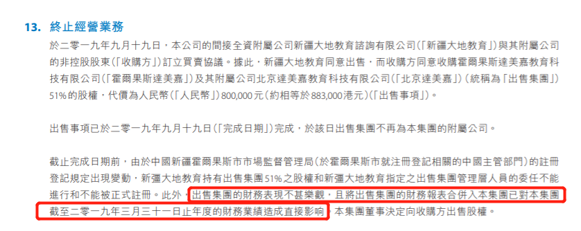 然而,2020財年,霍爾果斯達美嘉及北京達美嘉實現收益163.5萬港元,年內虧損216.6萬港元。由於“財務表現不樂觀”和“對集團2020財年業績造成直接影響”,2019年9月,大地教育就以80萬元人民幣出售霍爾果斯達美嘉51%股權,交易完成後,其不再為集團的附屬公司。