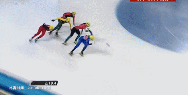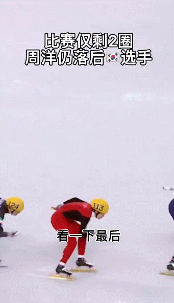 女子1500米的短道速滑賽場上,李堅柔被其他選手帶倒,滑出賽場,剩周洋一個人對抗剩下的3名對手,但這時的周洋已經成熟了很多,也穩當了很多。