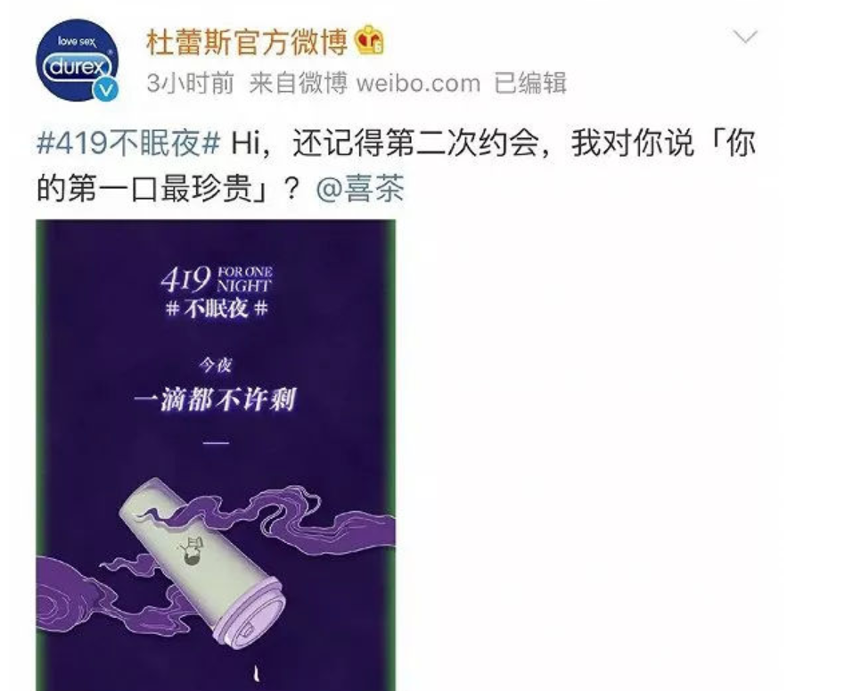 杜蕾斯先發微博:“第一口最珍貴”,海報配文為“今夜一滴都不許剩”。