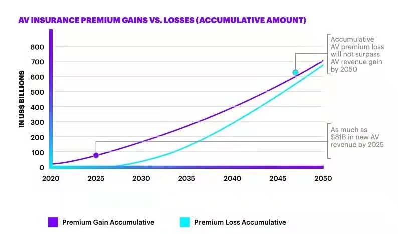 最終呈現出在2050年之前,由自動駕駛帶來的新收入累計值都是大於自動駕駛帶來的保費減少累計值的。