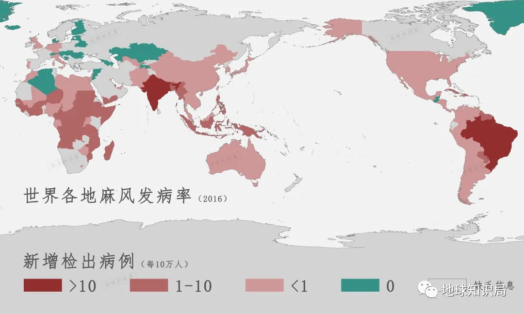 世界每10萬人新增麻風病例分佈地圖 ▼