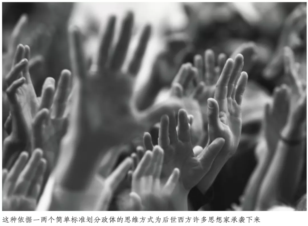 **這種依據一兩個簡單標準劃分政體的思維方式為後世西方許多思想家承襲下來,**我稱之為“政體思維”。從德謨克利特、蘇格拉底、柏拉圖、亞里士多德、西塞羅、阿奎那,到馬基雅弗利、博丹、斯賓諾莎、霍布斯、洛克、孟德斯鳩、盧梭,一直到現當代的詹寧斯、拉斯基、亨廷頓,都把政體分類作為政治研究的基礎。**政體分析看似簡單,但簡單的分析框架遇到複雜的現實世界就可能不知所措了。**中國到底屬於哪種政體?在很長時間裏,即使是慣於進行政體思維的西方人也説不清、道不明。