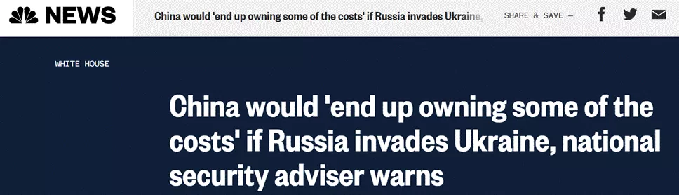 此前,在美國白宮之內,美國總統助理沙利文説道:北京最終將承擔俄羅斯入侵烏克蘭的部分成本。