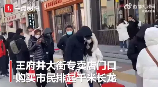 線上秒空,那就線下開工,即便是2月份北京街頭的寒冷氣温,也抵擋不住人們的熱情。在北京線下專賣店中好多市民排起了千米長隊去購買。