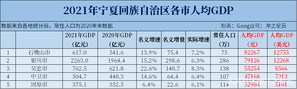 從人均GDP來看,排序為石嘴山、銀川、吳忠、中衞、固原。其中石嘴山、銀川人均在1萬美元以上。受地理因素限制,區內南北差距明顯,北部是“天下黃河富寧夏”的“塞上江南”,南部則山大溝深。人均最高的石嘴山是最低固原的2.41倍。