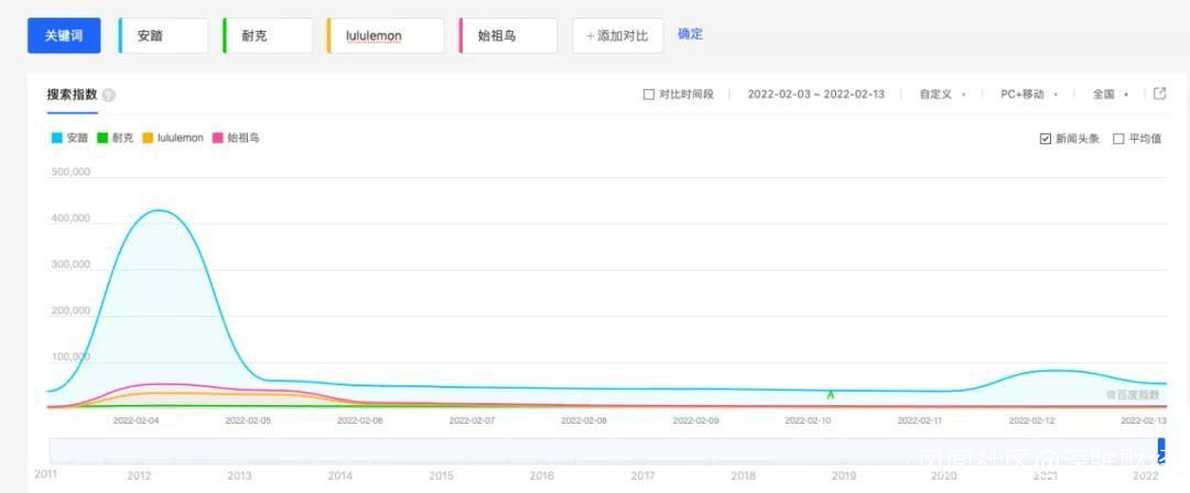 滿屏都是安踏,以百度搜索指數為例,能明顯看出,冬奧會期間安踏的討論熱度,遠高於其他運動品牌。