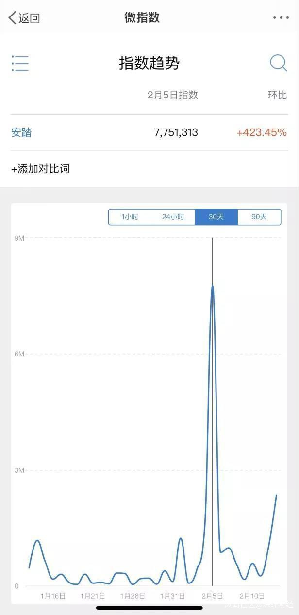 不僅是中國運動員,包括國際奧委會的官員、甚至是開幕式導演張藝謀也都身穿安踏,一時間,國貨“安踏”成為民眾討論的焦點,2月5日微博指數“安踏”詞條衝出了火箭式形態,環比上漲423.45%。
