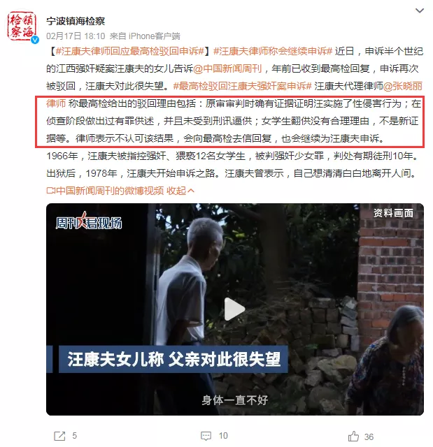 幾十年間,他向蓮花縣法院、吉安中院、萍鄉中院、江西省檢等司法機關發起過申訴,都以失敗告終。去年9月26日,最高檢受理了汪康夫的申訴,給了汪康夫莫大的希望,然而希望越大,失望越大。最高檢四個月後以三點理由駁回了汪康夫的申訴:
