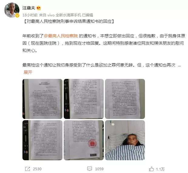 2022年2月17日,汪康夫發佈微博,稱1月28日收到了最高檢的刑事申訴結果通知書,最高檢駁回了他的再審申請,但當時因健康原因沒有及時公佈。