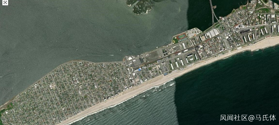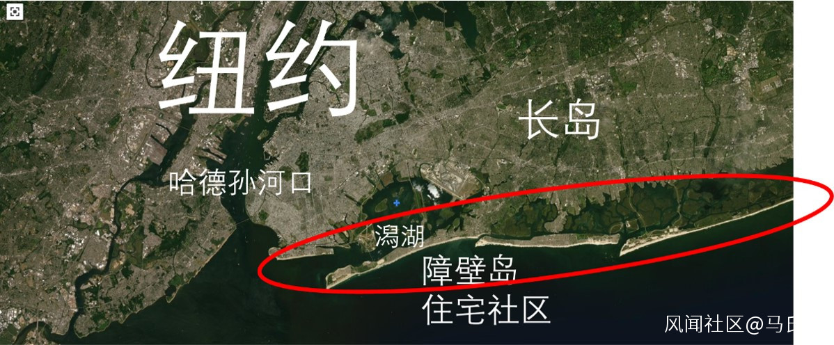 美國紐約長島南側,潟湖外的障壁島上是人口稠密的住宅區。美國東海岸分佈有一系列潟湖和壁障島,這些小島環境優美,其中很多是富人居住區或者度假勝地。