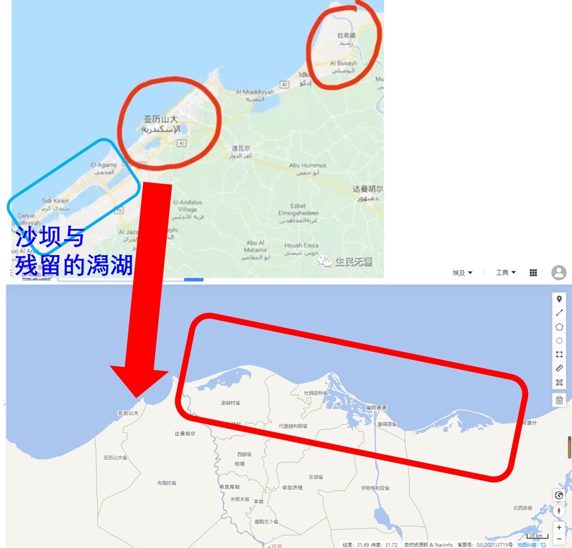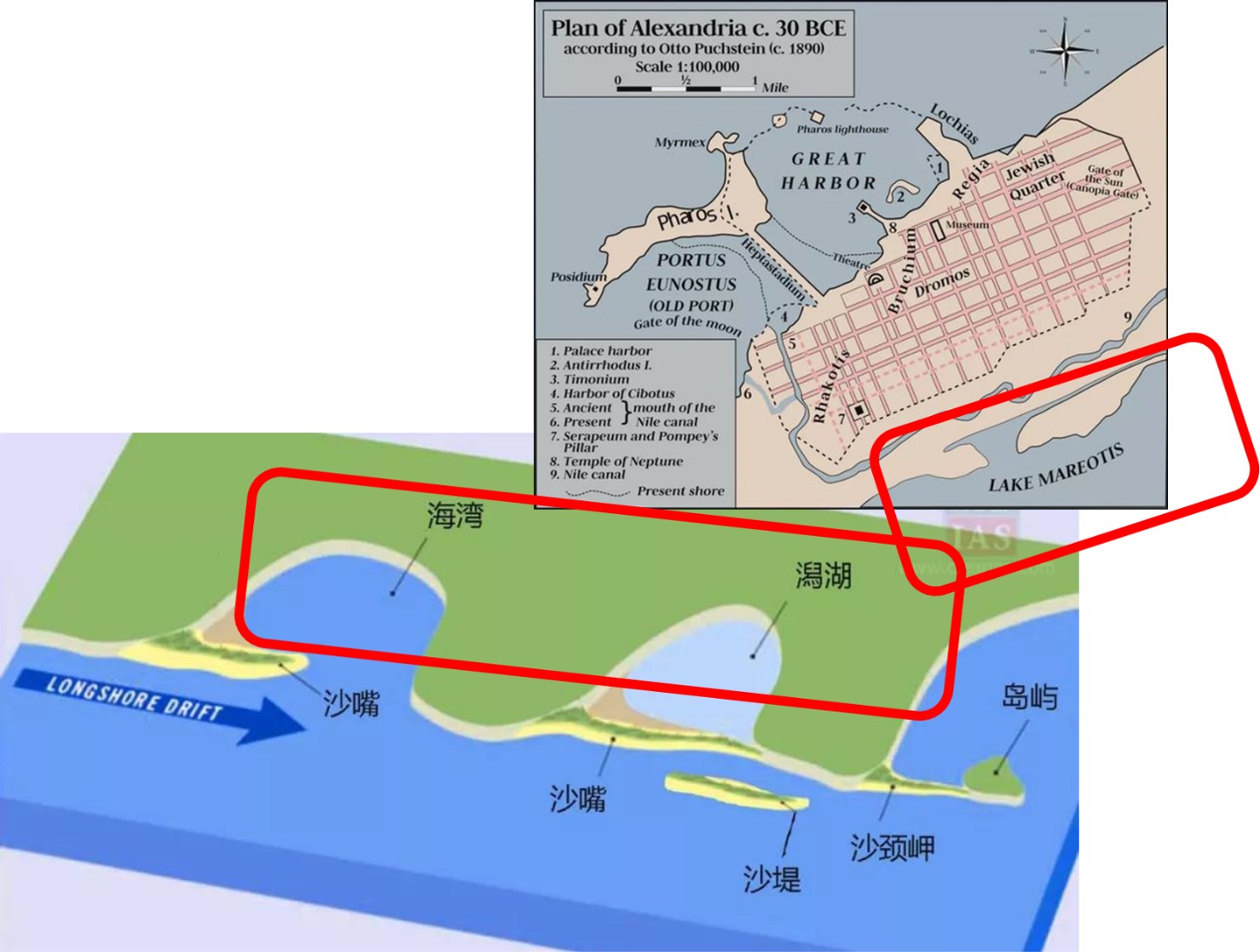 這是潟湖形成過程的示意圖和亞歷山大港古代(公元前30年)地圖,可見這座港口建立在狹長的陸地上,背後是一片湖,符合潟湖地貌的特徵。只不過隨着尼羅河帶來的泥沙不斷淤積,亞歷山大港背後的潟湖已經大部分變成陸地了。