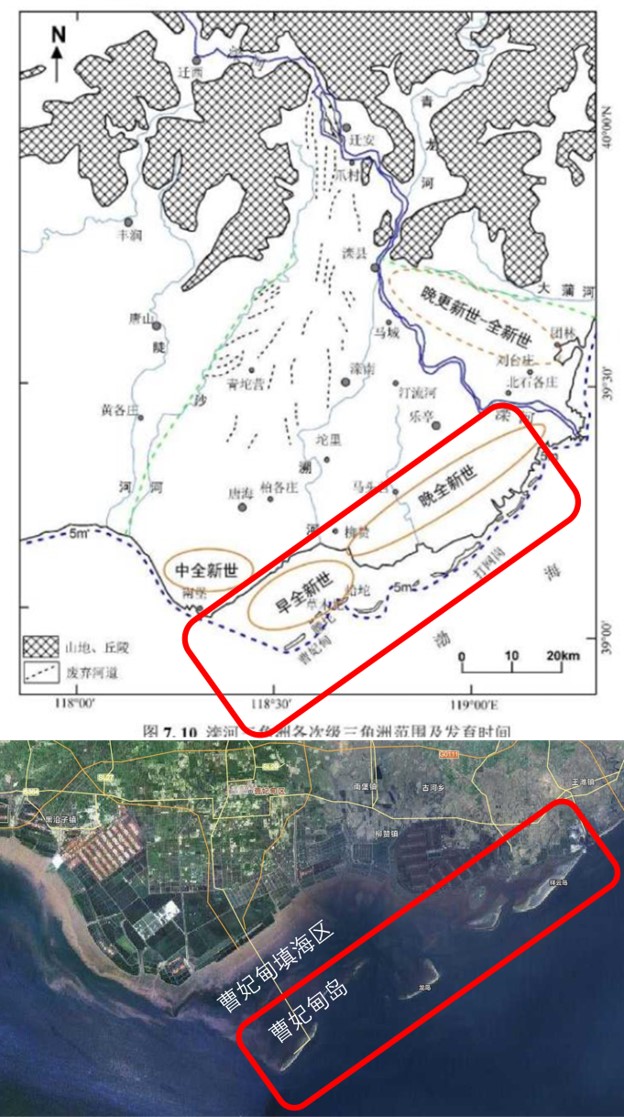 紅框處的沿海岸分佈的一系列狹長島嶼就是上述沙島,形成於早全新世(距今約8500-8000年),它們與大陸海岸間圍出的潟湖風平浪靜,是古代漁民的避風港。後來曹妃甸島與陸地之間的區域填海成為曹妃甸工業區,這個過程相當於加速了潟湖中灤河泥沙淤積造陸的過程。