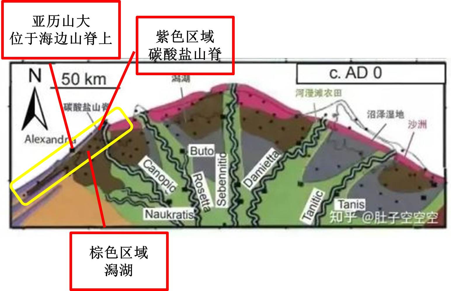 從地理的角度,對於第二條尼羅河三角洲形成過程的質疑其實很容易辯駁,貼出的地圖也已經給出答案了——亞歷山大等古代城市不是建立在新沉積的三角洲土地上,而是建立在古老的障壁沙壩(沙嘴、沙島)上,也就是説,這片地區古代就是伸向海中的狹長島嶼,後方的土地是後來潟湖被泥沙淤塞而形成的。