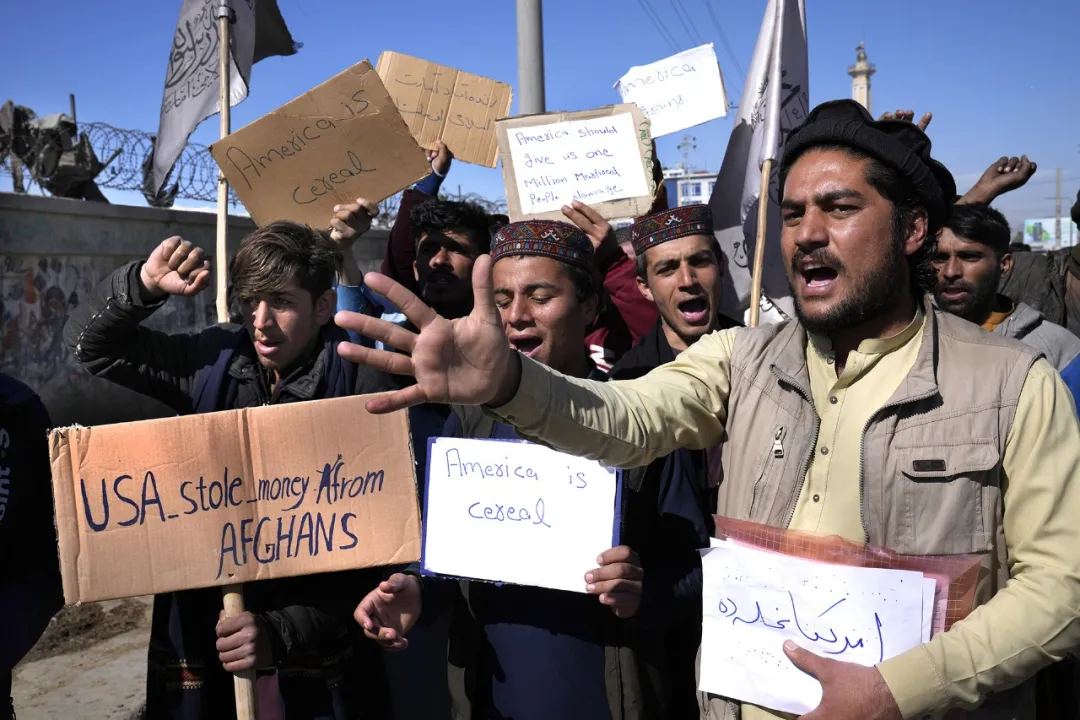 ▲2022年2月15日,數千名喀布爾民眾舉行示威活動,抗議美國掠奪阿富汗資產,譴責美國的舉動是公開盜竊。