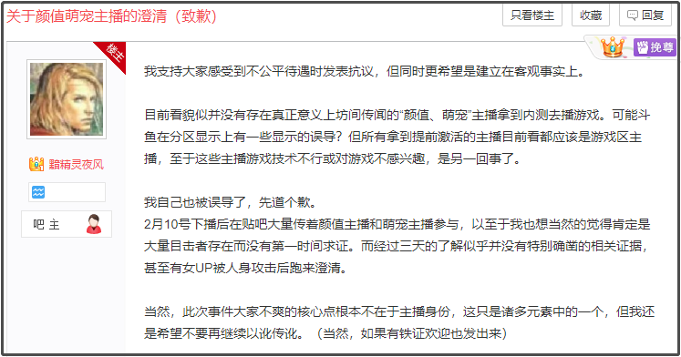 經過澄清,傳聞中所謂的顏值萌寵區女主播,實際就是遊戲區的人,無非操作技術熟練度遜於老玩家罷了。