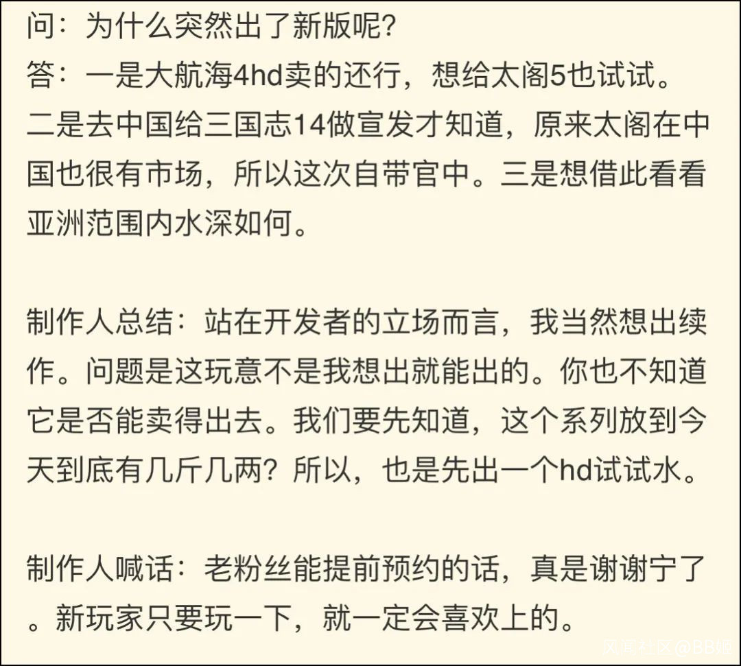 至於為什麼突然會出新版,主要還是《大航海時代4 HD》賣的還不錯,所以也想給太閣5試試。之前光榮在給《三國志14》做宣發的時候,日本那邊才知道太閣在中國很有市場。並呼籲老粉絲能提前預約遊戲的話最好不過了。