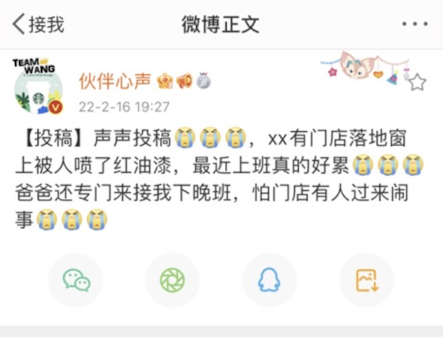 近一兩日的吐槽中,多為因本次事件引發的困擾。朋友的不理解、客户的不配合、無故謾罵外,還有一位員工投稿表示,有門店落地窗上被人噴了紅油漆,他的爸爸因為擔心門店有人來鬧事,已經開始專門接他下晚班了。