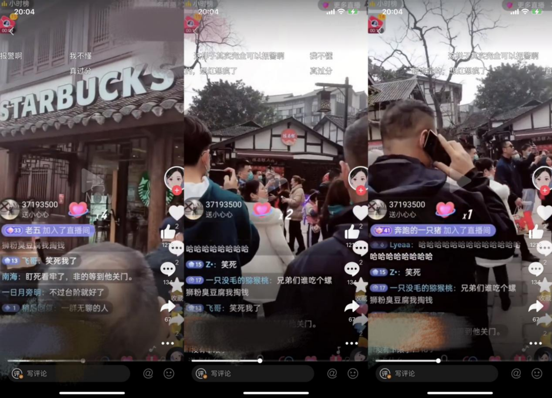 涉事門店門口的主播之間,也有一條“攀比鏈”:誰能進到星巴克門店裏頭,誰能在門口扔臭豆腐、扔雞蛋,誰能當着星巴克門店內的員工罵兩句,誰能去星巴克門口吐痰,誰就是勇者。