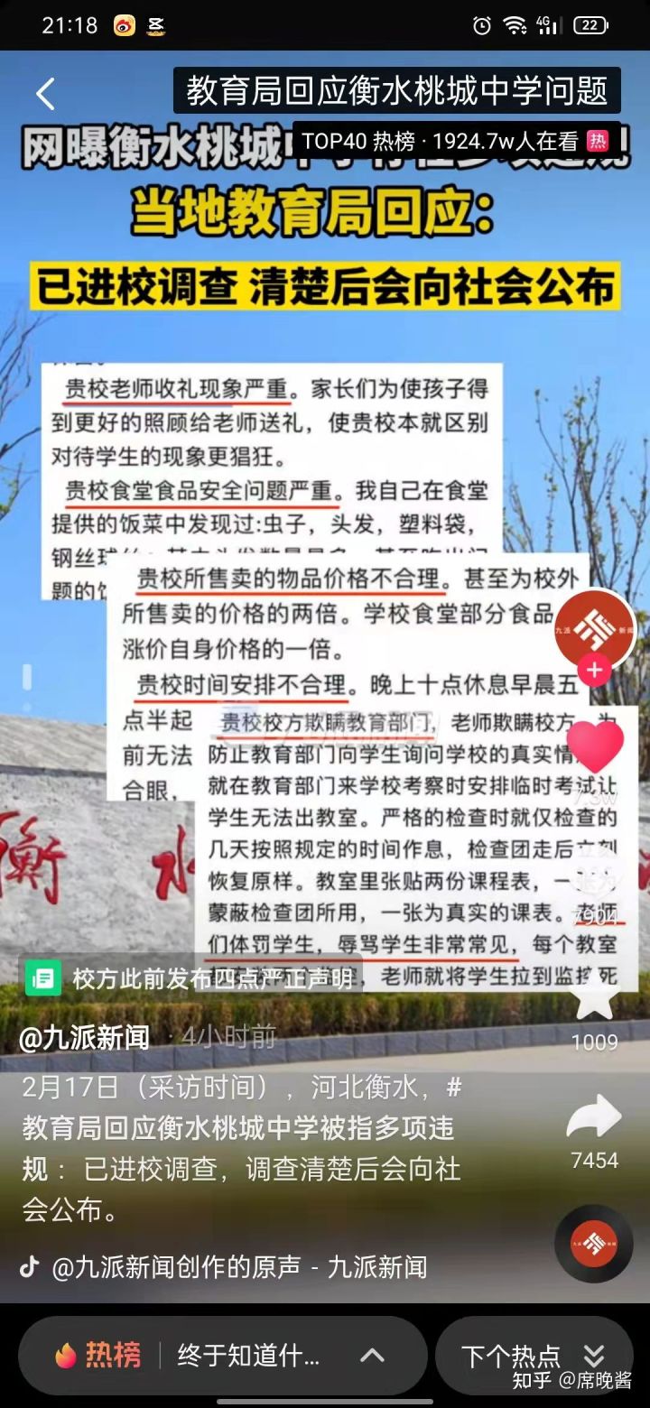 記者注意到,這名自稱為衡水桃城中學學生的網友,在文中列舉學校存在多項違規行為,比如頻繁考試,一週一小測,一月一大測,即使在網課期間也沒有停歇;老師體罰辱罵學生現象常見,被扇巴掌、打手心、把試卷作業扔到學生臉上屬於家常便飯;老師收禮現象嚴重;學校食堂存在食品安全問題;校內所賣的物品價格是外面的兩倍;學校時間安排不合理,十點休息,五點半起牀,課間休息只有五分鐘;洗腦式教育;強制性收費,飲用水收費、熱水收費;水質發黃,還經常停水等。
