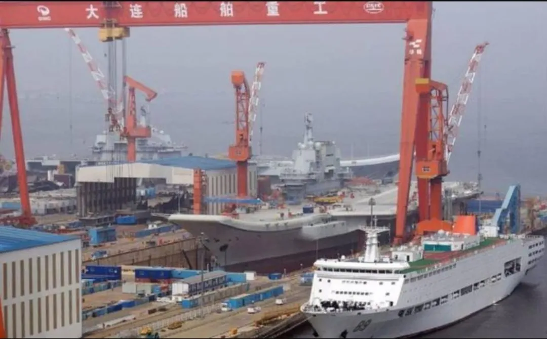 在2018年055型大型導彈驅逐艦批量下水的時候,有個現象引起外界的廣泛關注,那就是當時在大連造船廠內,竟然躺着一個規模超過法國海軍水面艦隊的航母艦隊,有正在建造的首艘國產航母山東艦,有準備維護的航母遼寧艦,有3艘正在建造的052D型驅逐艦,還有3艘正在建造(含下水)的055型驅逐艦,堪稱是建造中的航母打擊羣,其規模大致等於兩個法國海軍的主力艦隊。