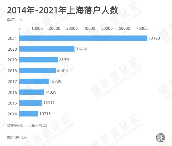 同年,上海落户人數直接在2020年31460人的基礎上翻番,總數高達73128人。其中,通過人才引進落户的數量,更是較2020年激增171%,約為2017年至2020年幾年人數的總和。