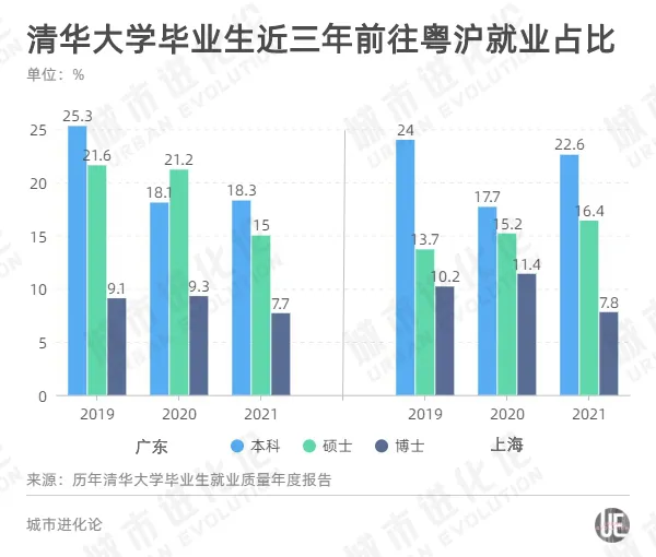 到了2021年,無論是本科、碩士還是博士,清華大學畢業生選擇上海的佔比,清一色壓過廣東。且上海三項數據分別領先廣東4.3、1.4和0.1個百分點。顯著的反超優勢,使上海和廣東二、三位的總排名正式對調。