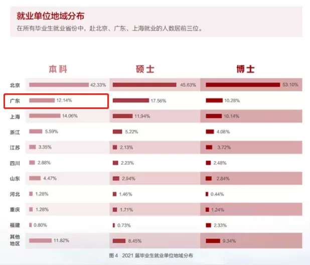 對於北京大學,本碩博三項數據廣東雖然沒有被上海全面反超,但警鐘也已敲響。本科畢業生就業佔比的單項排名中,廣東已從2019年的26.79%,腰斬至2021年的12.14%;從“最受歡迎”的寶座,被北京和上海擠至第三。