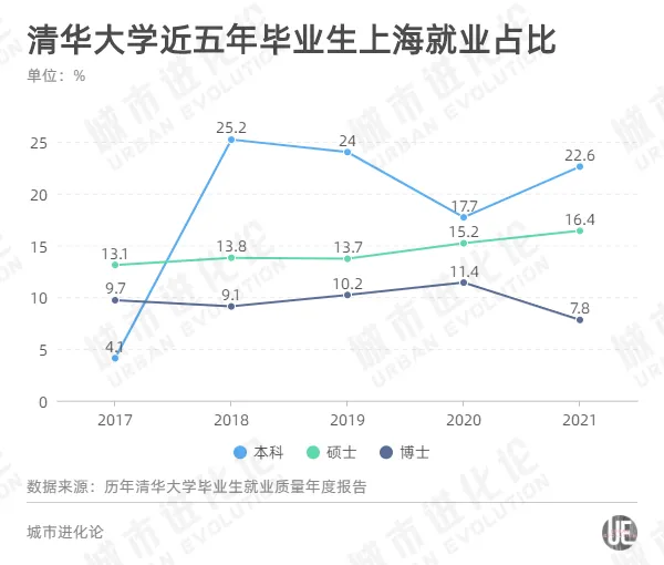 2017年北京大學畢業生就業質量年度報告顯示,當年北大本碩博畢業生,選擇上海就業的僅佔2.77%,共67人;而前往成都就業的都有79人,杭州更是多達106人。同年,清華大學情況類似:僅4.1%的本科畢業生選擇奔赴上海,約為浙江的一半。
