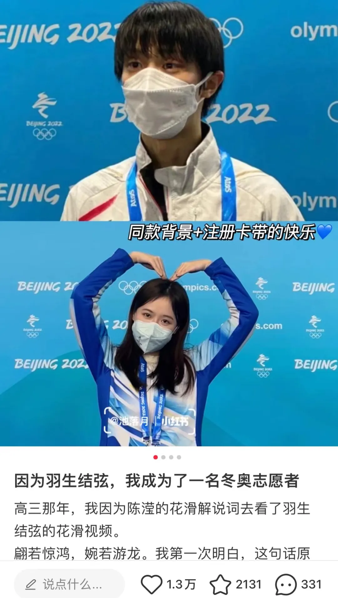 為了可以見一面羽生結弦,劉橙報名了北京冬奧志願者。2月8日中午,在現場看完羽生結弦完男子花滑比賽後,她在小紅書發佈了一條筆記,封面是自己打卡羽生的同款背景牆的照片。