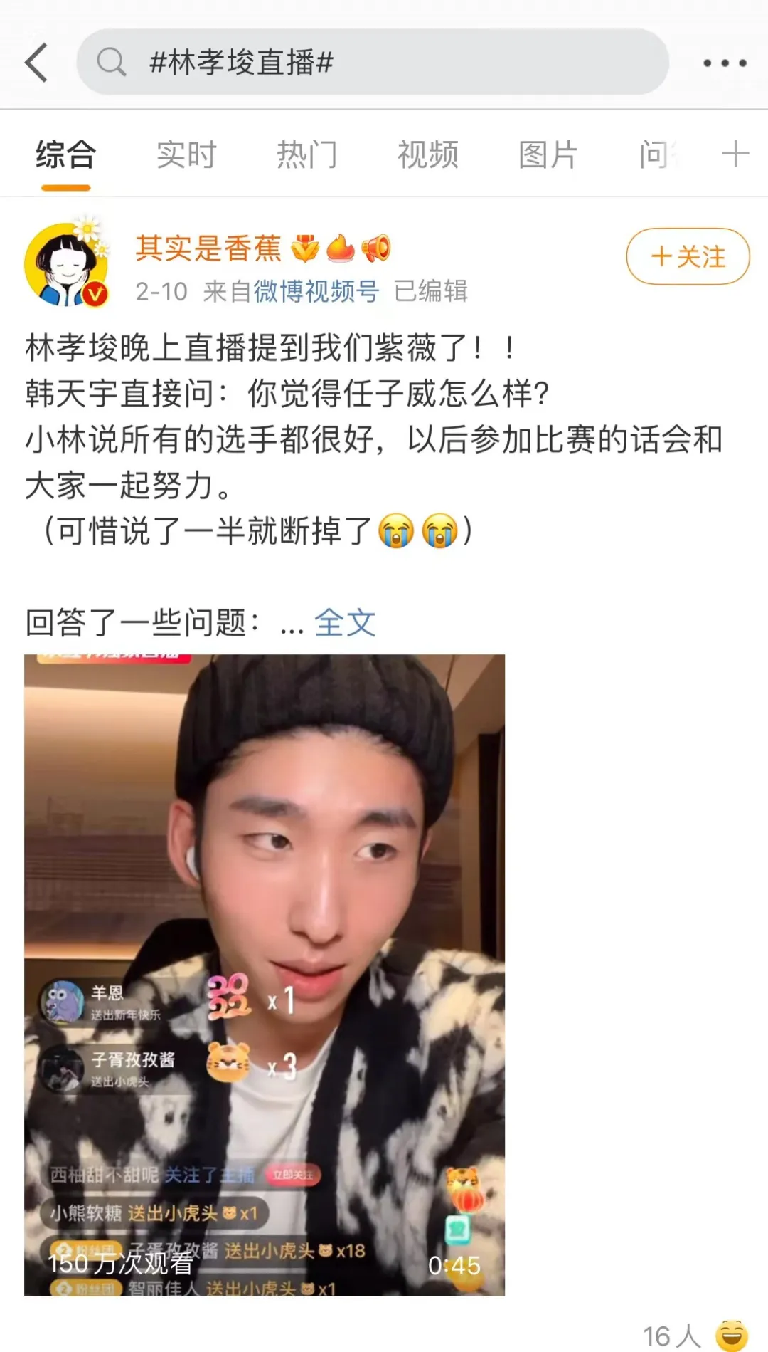 當晚,歐樂守在手機前,一步不動看完了整場直播。同時,看着#林孝埈直播#話題登上熱搜第一位時,歐樂在微博上編輯了數條直播片段,想要努力“蹭”上直播熱度。