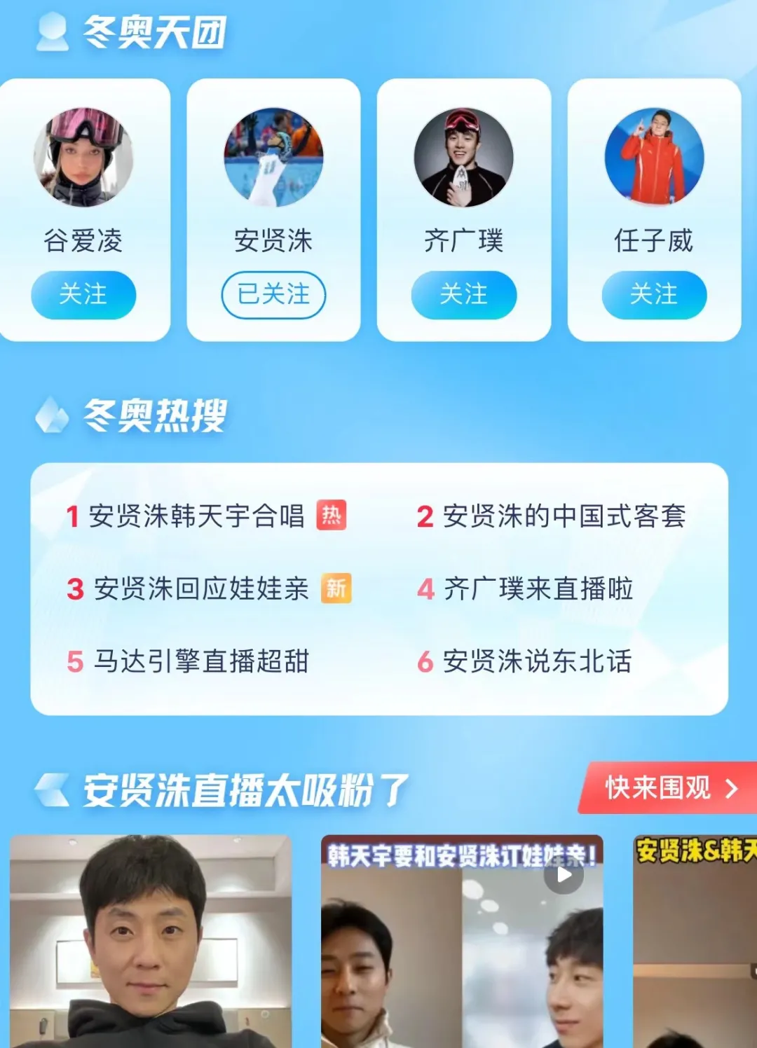 在冬奧期間,除了小紅書,運動員直播還活躍於各個平台。王濛在咪咕直播解説賽事,在抖音直播聊天,範可新在快手直播分享自己的賽場感悟。