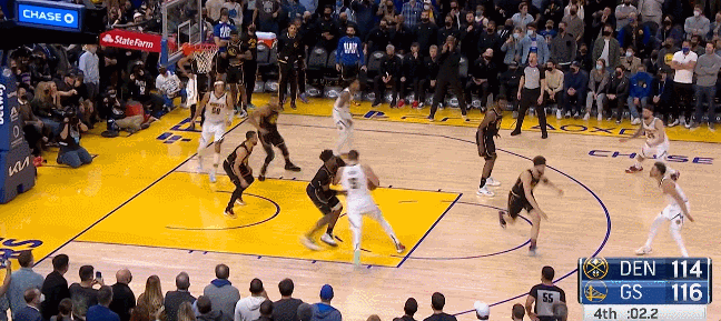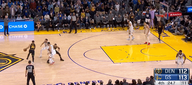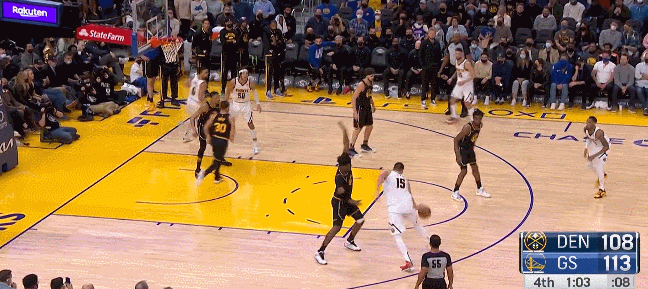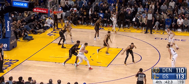 約老師接到球之後,觀察到了勇士沒有夾擊的意圖,一路努着屁股把盧尼頂到籃下輕鬆打進,112-113,掘金追到只差1分。
