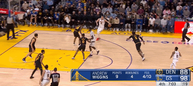 直到第四節還剩7分鐘,約老師到肘區背身,把勇士所有的防守壓縮到了罰球線以下,再助攻莫里斯投進空位三分。這,是掘金首發除約老師以外投進的第一個三分,掘金追到91-98,勇士暫停。