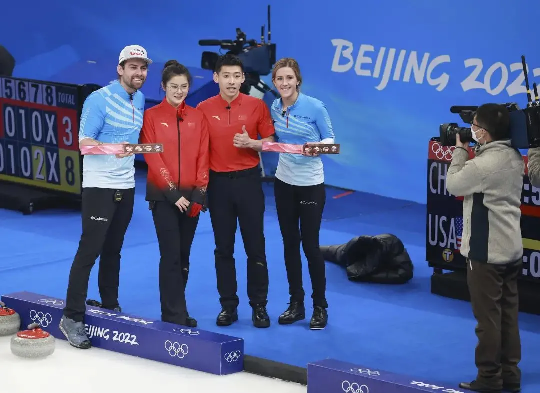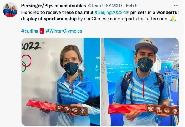 在當天的冰壺混雙循環賽第八輪結束後,以5-7不敵美國組合佩辛格/普利斯的中國隊二名選手凌智和範蘇圓,親手將兩盒冰墩墩徽章贈予對手。