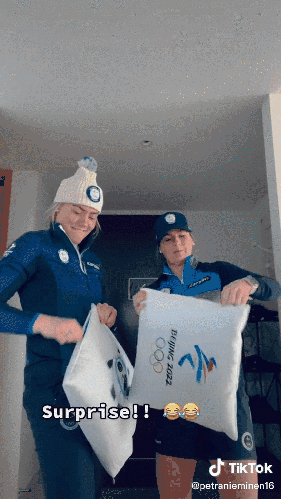 他們一名運動員騎在另一名全身挺直的運動員身上,從賽道高處滑下,樂得前仰後合,彷彿在對着鏡頭説“媽媽快看我參加冬奧會了”。