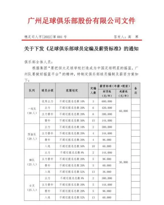 廣州足球俱樂部16日發佈《足球俱樂部球員定編及薪資標準》,文件制定了該俱樂部球員編制和薪資方案, 人員包括一線隊、預備隊、梯隊和女足共計100人,封頂最高年薪為税前60萬元人民幣。