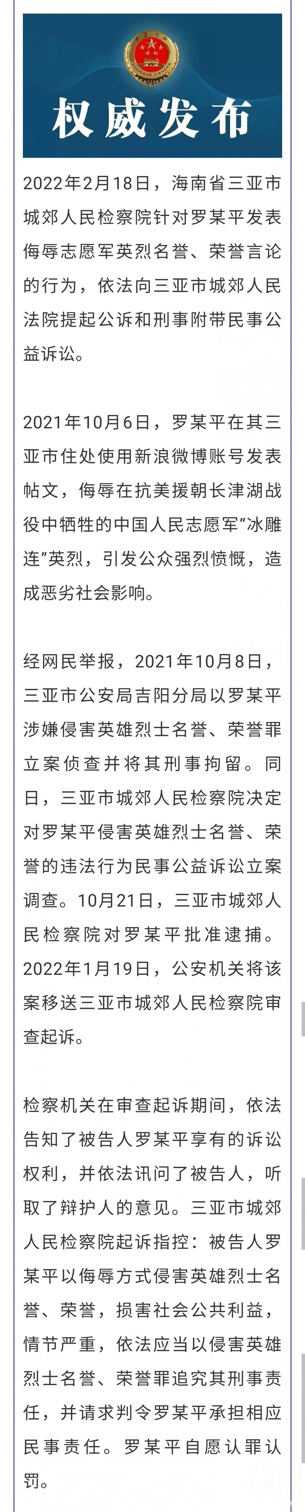 上游新聞2月18日,海南省三亞市城郊人民檢察院針對羅某平發表侮辱志願軍英烈名譽、榮譽言論的行為,依法向三亞市城郊人民法院提起公訴和刑事附帶民事公益訴訟。