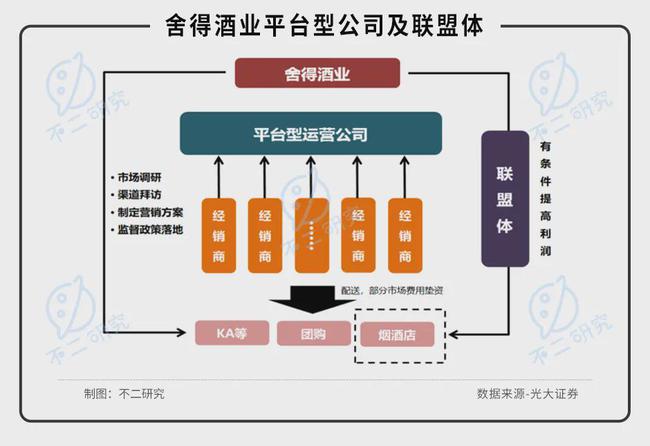 2020年至今,隨着天洋系退場,原捨得元老迴歸。在復星系進駐後,捨得酒業在原“1+1”渠道的基礎上,通過平台型、經銷商聯盟、KOL、直銷四種模式共同推近捨得酒業渠道模式。