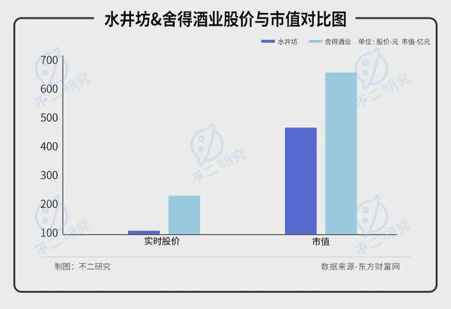 截至2月18日,水井坊報收100.26元/股,對應市值489.26億元;捨得酒業報收200.77元/股,對應市值666.56億元。