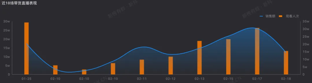 東方甄選過去十場直播彙總,銷售額與觀看人次並不成正比,整體表現一般。在1月25日、2月10日、2月13日以及2月17日的幾場直播中,均出現觀看人次高於銷售額情況;其中1月25日這場直播觀看人次近30萬,銷售額為20萬。