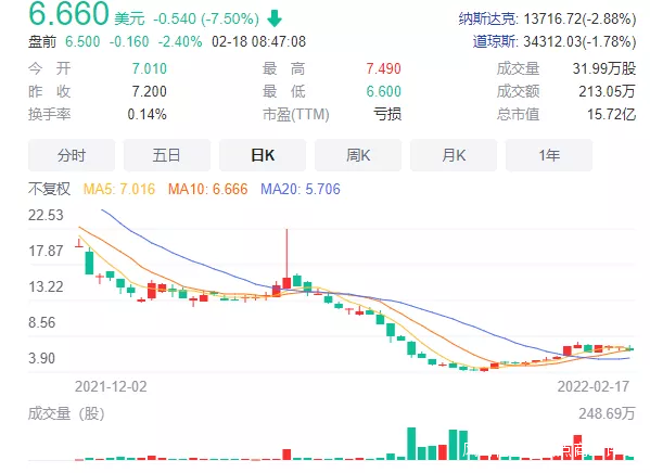 或許出乎梁昌霖意料的是,亮麗財報仍然未提振股價,吸引投資者埋單。美東時間2月17日,叮咚買菜開盤大跌6.94%,最新股價為6.66美元,較IPO時23.5美元發行價低了70%。