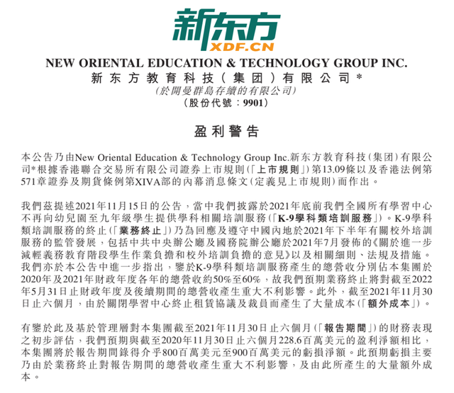 1月21日,新東方公告,預期集團截至2021年11月30日止6個月,錄得8億美元至9億美元的虧損淨額,主要由於業務終止對報告期間的總營收產生重大不利影響。