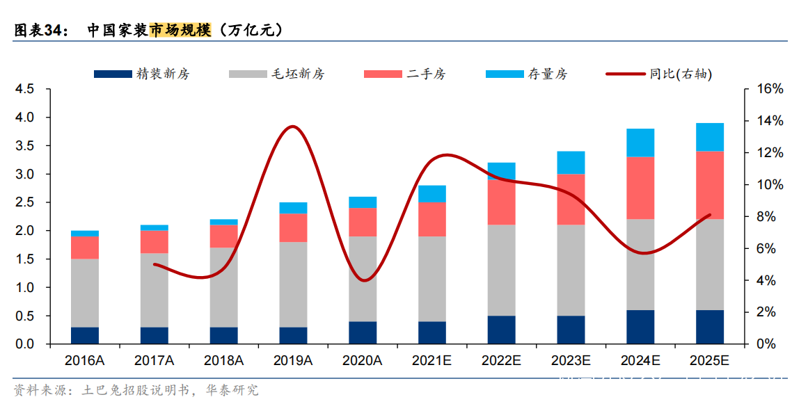 根據華泰證券的數據顯示,2015-2019年,我國家裝行業的市場規模持續增長,2019年我國家裝行業市場規模達到2.74萬億元。2020年,因為疫情,規模增速同比下降,但長期看前景無限。