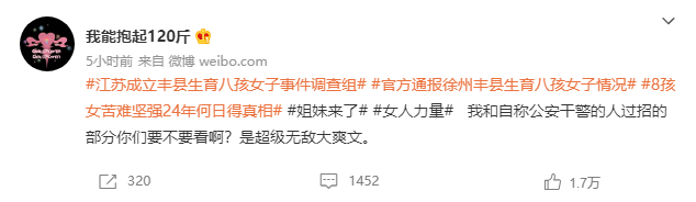 發現瞭如下內容,”在2022年2月11日9點左右**,”@我能抱起120斤“**為了聲援豐縣八孩媽媽,去豐縣精神病院內上廁所時被搶走手機。“