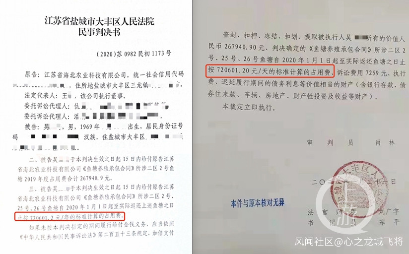 鹽城市大豐區人民法院審理後作出判決:被告吳先生15日內將魚塘返還給原告海北公司;被告向原告給付2號魚塘2019年佔用費用267940.9元;給付2號、25號、26號魚塘自20201月1日起至實際返還之日止,按720601.2元/年的標準計算佔用費。