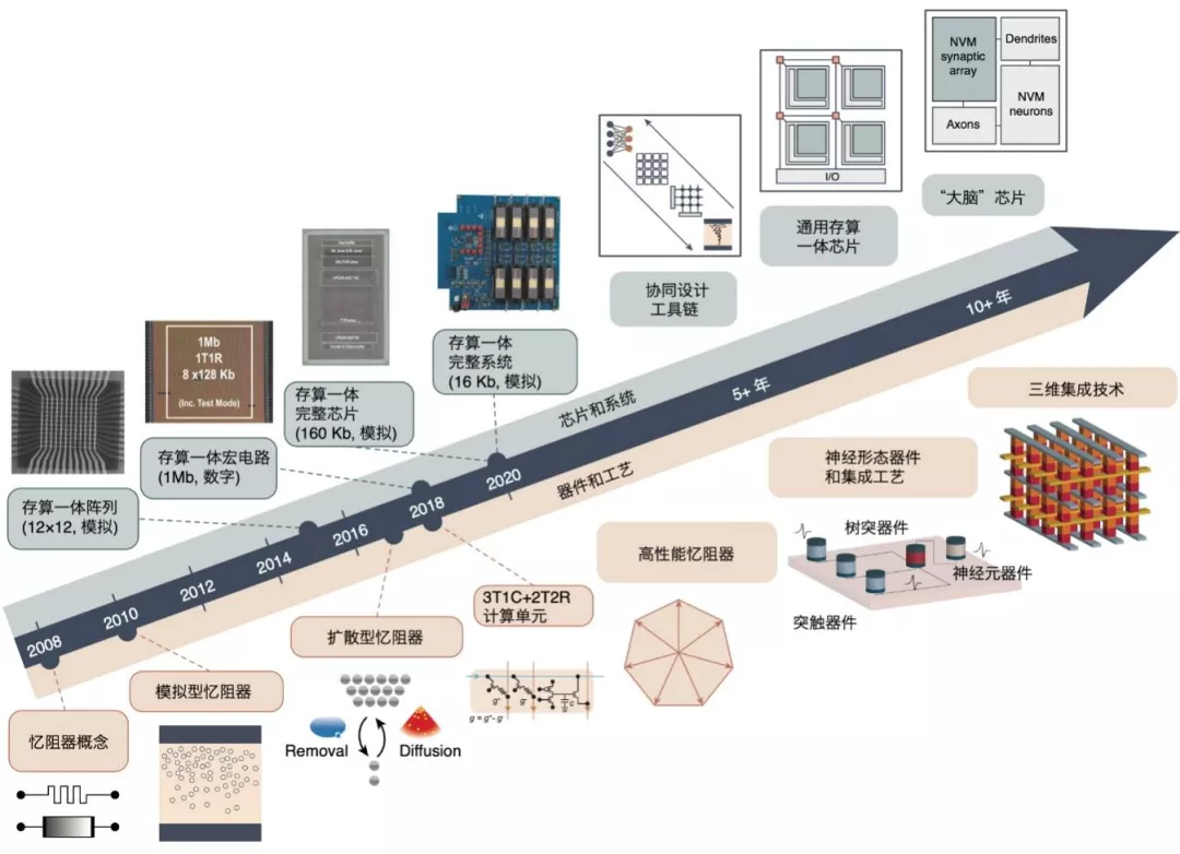 讓芯片存算一體化擁有兩種方案:其一是將處理器和存儲器放在同一芯片上,以減少數據交換、提升計算效率,但處理器和存儲器的製備工藝不兼容,且芯片中存儲器密度受限,以目前及未來一段時間的技術水平來看,製造這種存算一體芯片的難度較大;其二是基於新型存儲材料和器件,是目前業界積極推進的一種方案[13]。