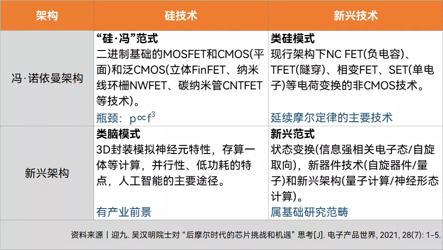 功耗牆:馮·諾依曼架構中,數據在處理器和外部存儲器中頻繁高速傳遞,會導致系統功耗很高。與此同時,摩爾定律接近瓶頸,芯片特徵尺寸已進入量子效應顯著的範圍,引起一系列次級物理效應,包括柵隧穿泄漏、載流子界面散射、強場速度飽和、源漏寄生電阻佔比增大等,導致功耗密度快速上升[11]。